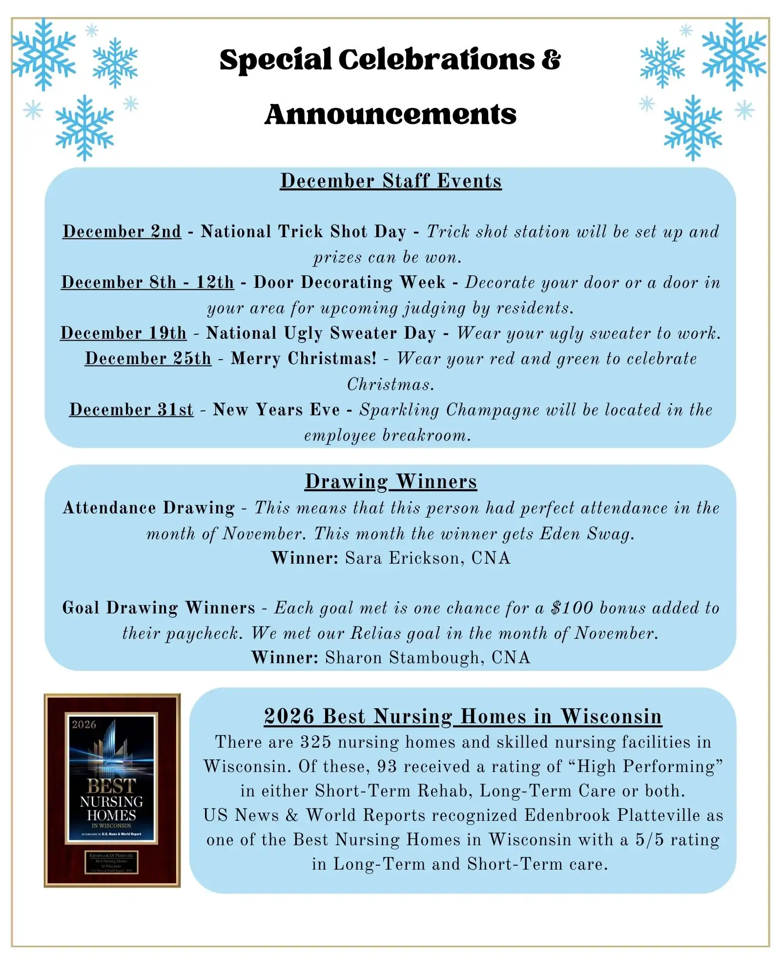 Edenbrook of Platteville is an industry leading skilled nursing facility dedicated to delivering excellence in post-acute rehabilitation and long-term care. We cultivate a culture and family-like environment to attract the best healthcare professionals and caregivers that ensure that each guest is not treated like a patient…. but like family.